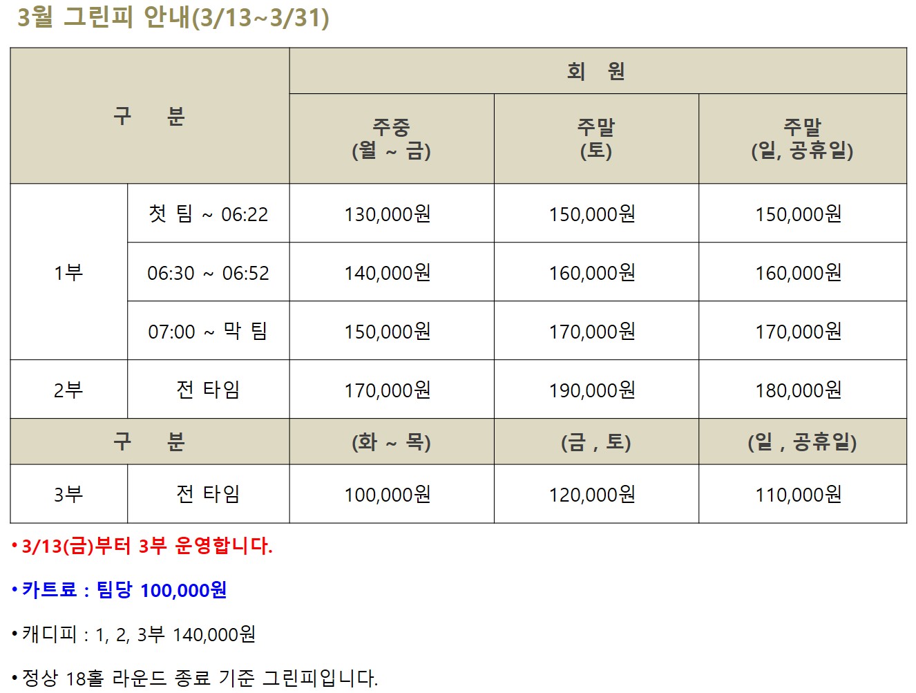 3월 그린피 안내(3/13~3/31)